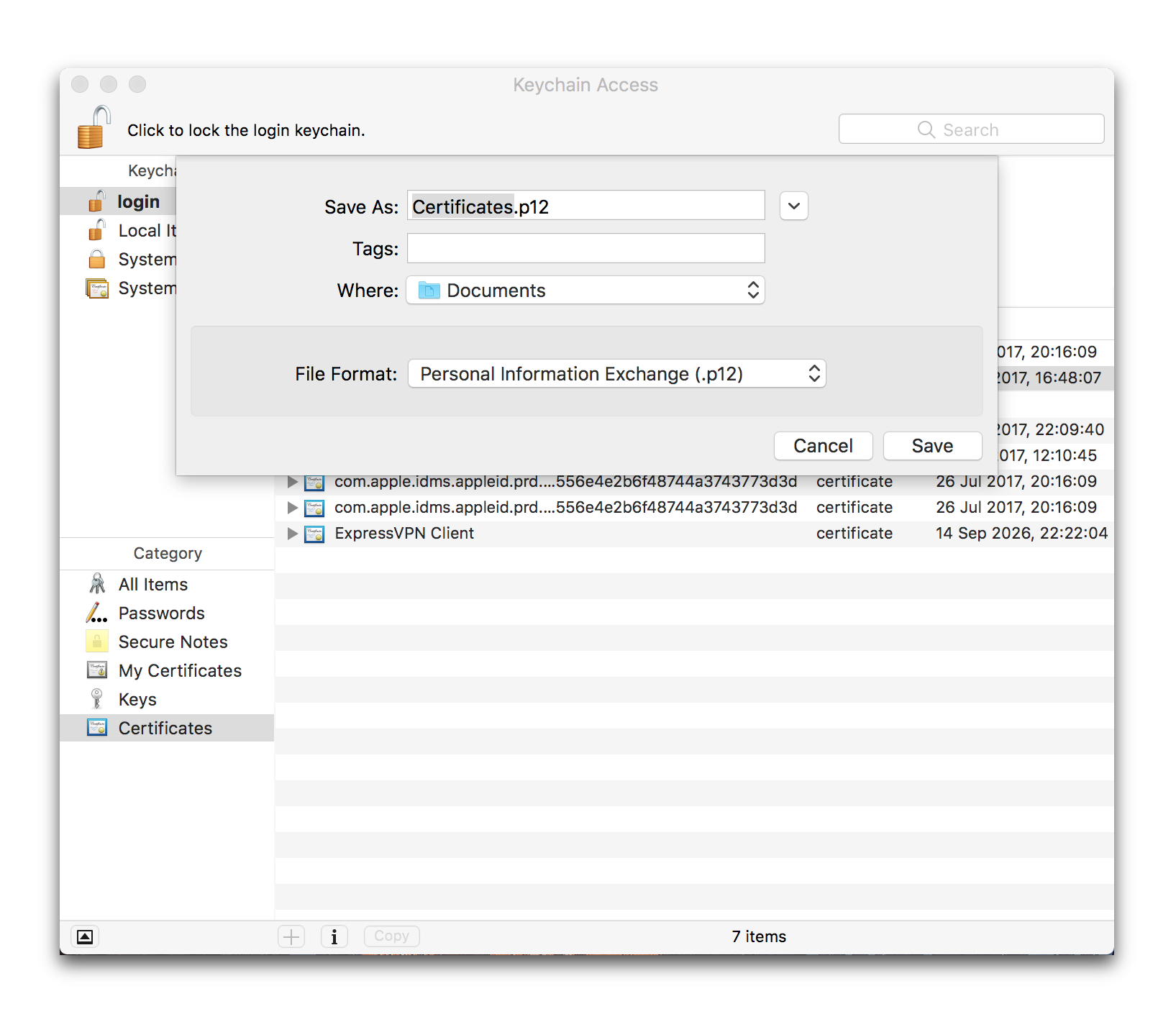 For the push library we use when using Django on Heroku, we need the certificate in a .pem format. The first step to achieving this is to export the certificate from the keychain.
