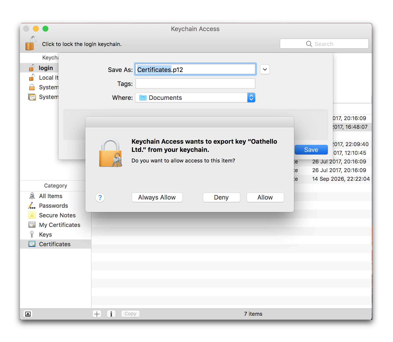We must grant the Keychain Access app permission to export the certificate. Press “Allow” to do so.