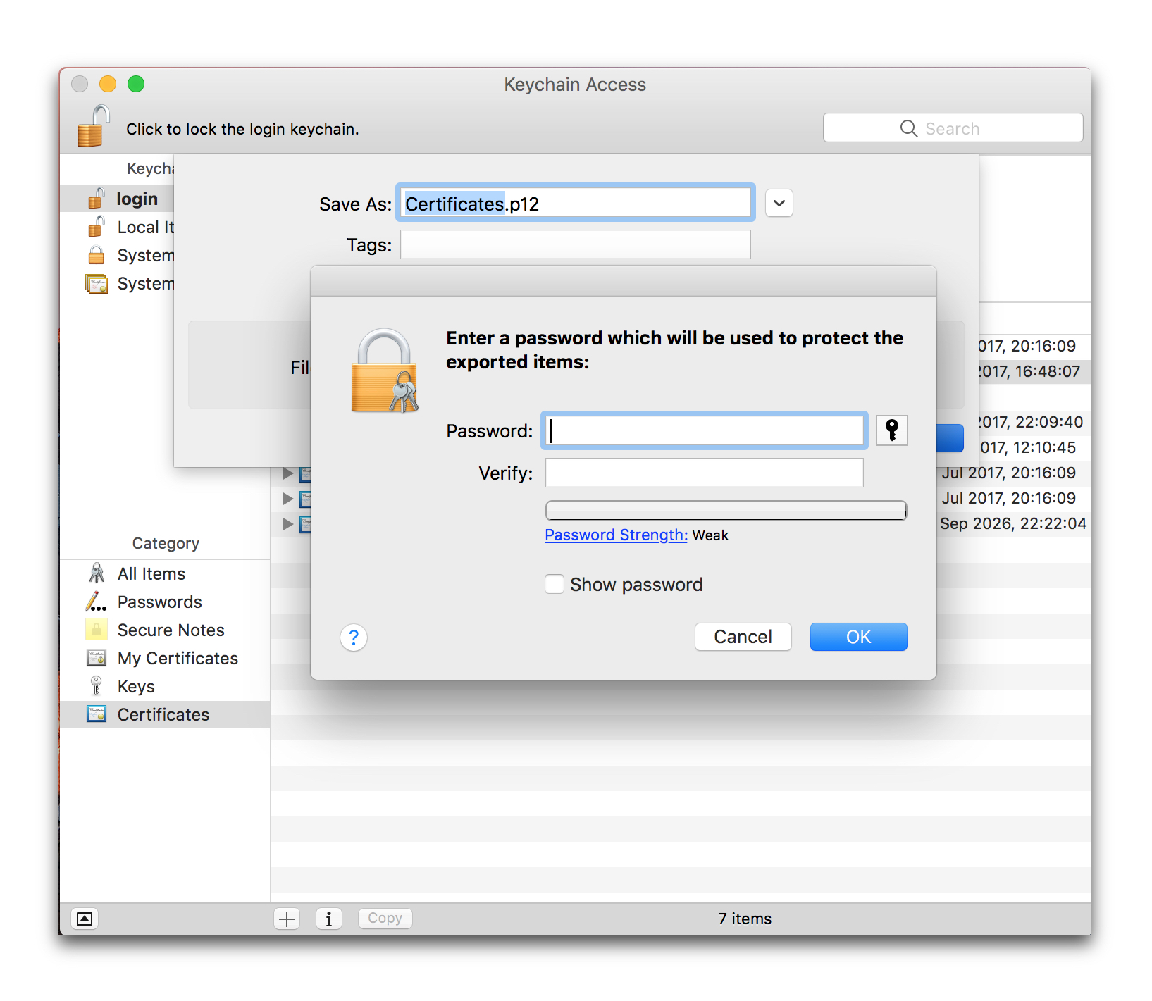 We can specify a password for the certificate. The library we use doesn’t support passwords so we leave these fields blank and then press “OK”.