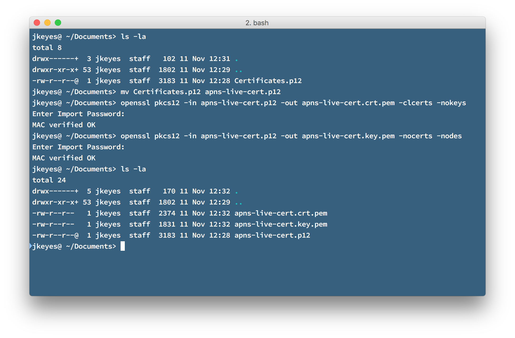 The final step is to use openssl to convert the .p12 file into the cert pem and the private key pem.