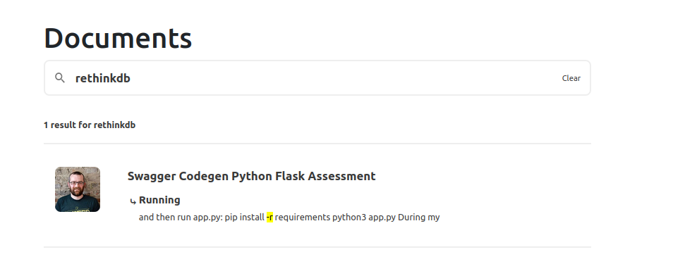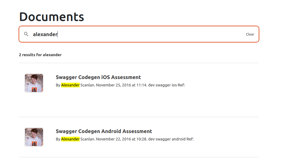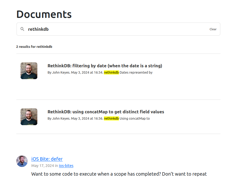 However, if we search for a word that is only in a page category, or an author’s name, it doesn’t appear in the results.